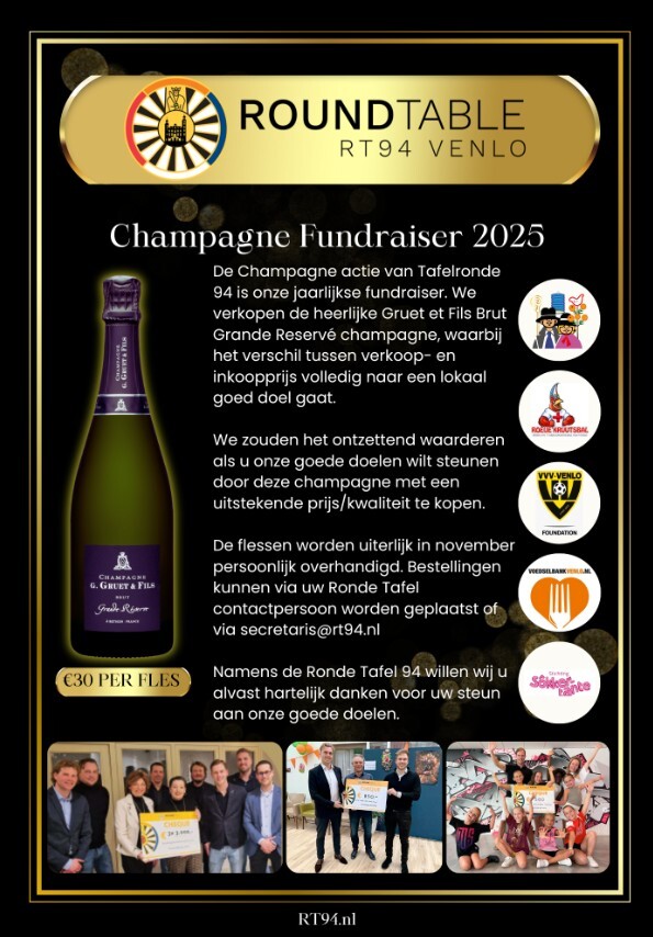 Ieder jaar rond oktober vindt onze champagneverkoop plaats. Het brede netwerk van de Tafelronde Venlo wordt dan ingezet om champagne te verkopen.